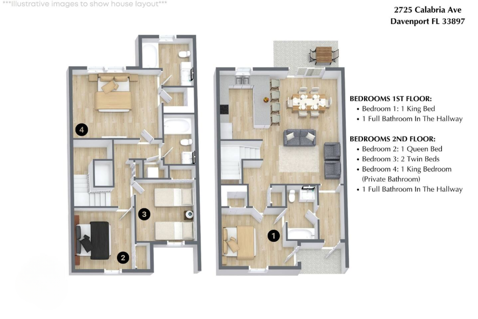• Community: Regal Palms • 4 Bedrooms/ 3 Bathrooms/ Sleeps 8 • Disney (9.0 mi) SeaWorld (21.0 mi) Legoland (29.2 mi) • Convention Center (12.9 mi) Universal Studios (22.3 mi) • Location: Calabria Avenue, Davenport FL 33897 DETAILS • Central AC • Washer & Dryer • Gated Community • TV In Every Bedroom • Free Cable TV & WIFI • Fully Equipped Kitchen • Towels & Linens provided • Washcloths are not provided • Family Room with Flat Panel TV • Hair Dryers, Iron & Ironing Board • Private Door Code for Each Guest Stay • Pack 'n play/ High Chair (Free Upon Request) BEDROOMS FIRST FLOOR Bedroom 1: 1 King Bed + Full Bathroom BEDROOMS SECOND FLOOR Bedroom 2: 1 Queen Bed Bedroom 3: 2 Twin Beds Bedroom 4: 1 King Bed (Private Bathroom) + Full Bathroom In The Hallway - USEFUL INFORMATION • CHECKING IN AND OUT - Check-in after 4:00 PM - Checkout before 10:00 AM REGAL PALMS RESORT - $20 + 12% tax PER DAY / PER HOME It is paid directly to the Regal Palms Resort at check-in. This fee is mandatory and intended to cover maintenance and security costs of the resort. When you check-in at the front desk, you will receive a pass that gives you access to the gate and the home. A wristband will be given which allows access to the resort area. Amenities: - Sauna - Hot Tub - Lazy River - Water Slide - Clubhouse - Fitness Center - Resort-Style Pool - Complimentary towel service and lounge chairs in the pool area. - RESORT REGISTRATION NEEDED AFTER BOOKING CONFIRMATION. • PARKING Parking is free up to 3 vehicles. $10 + tax per day for each additional vehicle. Commercial vehicles, RV's, Trailers, Buses, Golf carts, recreational vehicles, or watercraft is not permitted at Regal Palms. • THIS HOME IS SELF-CATERING We do provide a small welcome kit to get you started. Please stop by the nearest supermarket to gather any additional items you may need for the duration of your stay. • TRASH DISPOSAL Please dispose the trash daily in the plastic bench or dumpster to keep a clean home. • HOUSEKEEPING There is no daily housekeeping service provided in the rental rate. Before check-in, the unit will be thoroughly cleaned and inspected by a professional cleaning company. Mid-stay cleaning services during your stay can be requested for an additional fee. • ONLINE PURCHASE If the online seller uses USPS, it will not get delivered as the Post Office does not recognize vacation homes as regular addresses and the package will be returned back to the sender. Only UPS, DHL and FEDEX delivers them. In some resorts the packages are delivered to the clubhouse. Fees may apply. Some resorts may not accept them. Keep in mind we are not responsible for unexpected issues with your online purchases. If you have any questions, please contact us. PLEASE NOTE: Additional charges apply when the owner has to fix something or pay for additional cleaning if not complied.