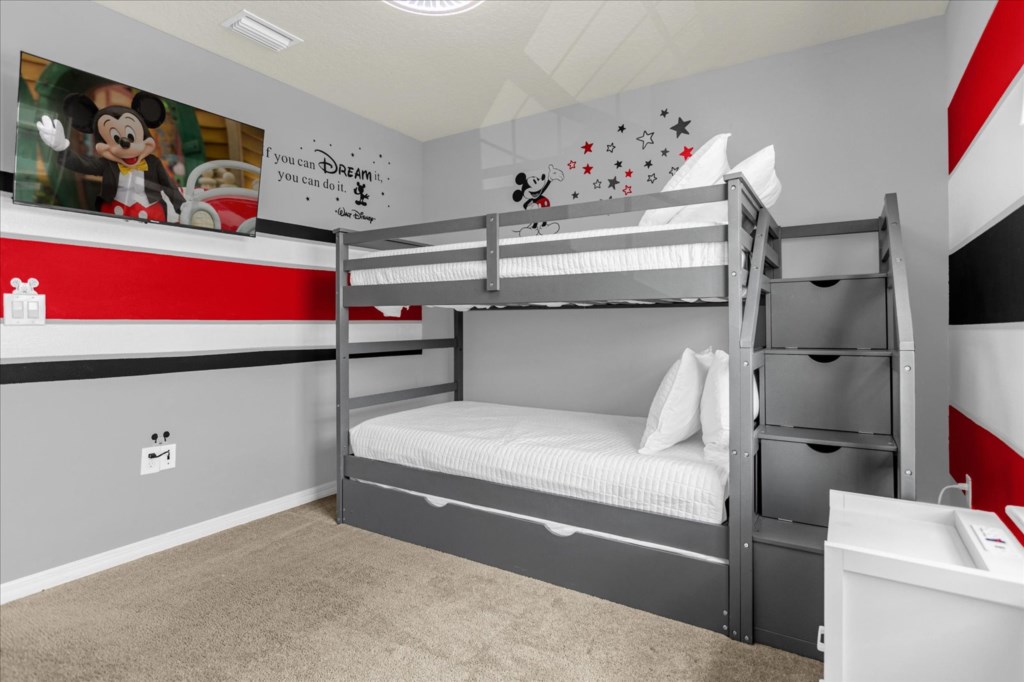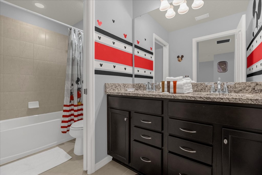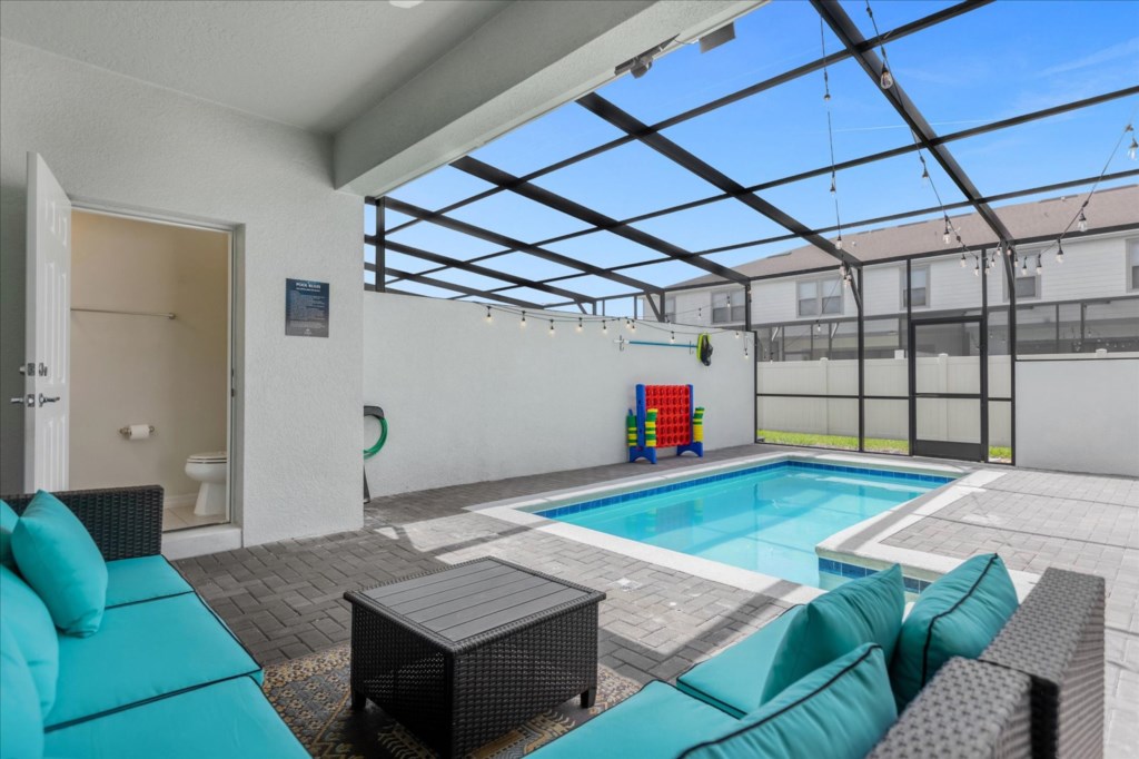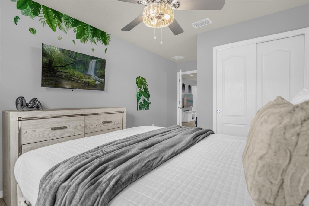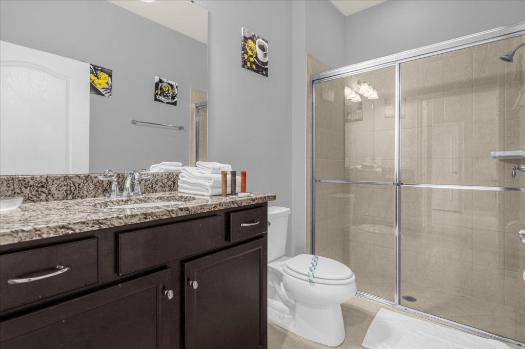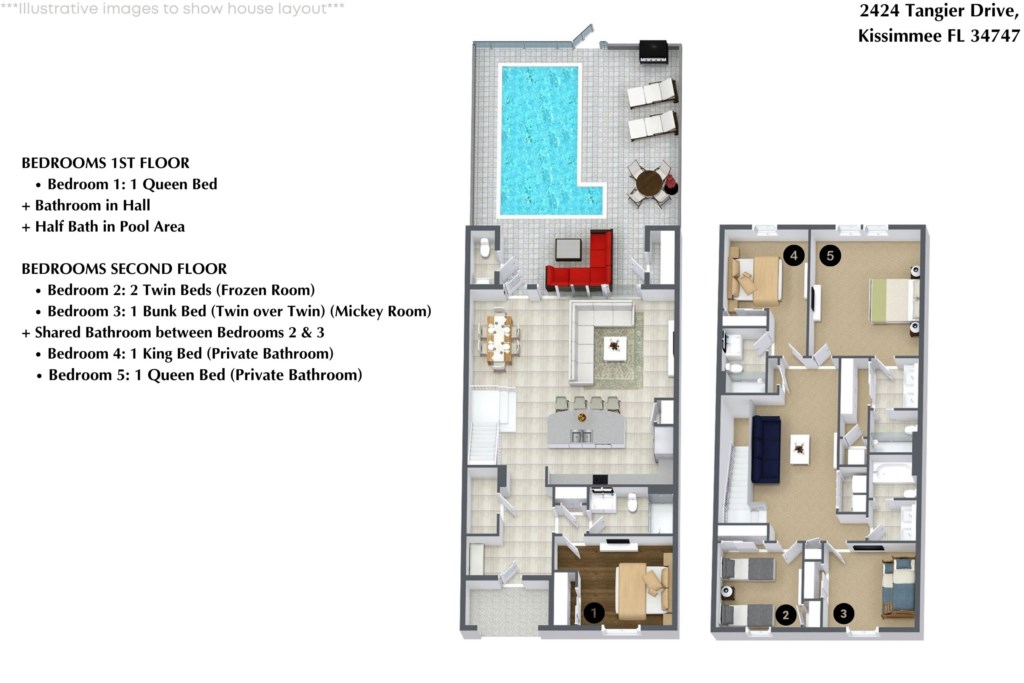 • Community: Windsor At Westside • 5 Bedrooms/4.5 Bathrooms/Sleeps 10 • Disney (6.7 mi) SeaWorld (16.2 mi) Legoland (28.0 mi) • Convention Center (10.5 mi) Universal Studios (20.0 mi) • Location: Tangier Drive, Kissimmee FL 34747 DETAILS • Central AC • Washer & Dryer • TV In Every Bedroom • Free Cable TV & WIFI • Fully Equipped Kitchen • Towels & Linens Provided • Washcloths Are Not Provided • Family Room with Flat Screen TV • Hair Dryers, Iron & Ironing Board • Private Door Code for Each Guest Stay • Outdoor Patio Furniture with Sun Loungers • Pack 'n play/ High Chair (Free Upon Request) • Private Screened-in Pool + Child Safety Pool Fence • Xbox One BEDROOMS FIRST FLOOR Bedroom 1: 1 Queen Bed + Bathroom in Hall + Half Bath in Pool Area BEDROOMS SECOND FLOOR Bedroom 2: 2 Twin Beds (Frozen Room) Bedroom 3: 1 Bunk Bed (Twin over Twin) (Mickey Room) + Shared Bathroom between Bedrooms 2 & 3 Bedroom 4: 1 King Bed (Private Bathroom) Bedroom 5: 1 Queen Bed (Private Bathroom) - USEFUL INFORMATION • CHECKING IN AND OUT - Check-in after 4:00 PM - Checkout before 10:00 AM • WINDSOR AT WESTSIDE PARKING - Parking is free. - Maximum of 3 Vehicles. Vehicles exceeding the limit will not be permitted entry and must arrange for offsite parking. - Commercial vehicles, RV's, trailers, buses, golf carts, recreational vehicles or watercraft is not permitted at Windsor At Westside. There is a $50 fee violation. • THIS HOME IS SELF-CATERING We do provide a small welcome kit to get you started. Please stop by the nearest supermarket to gather any additional items you may need for the duration of your stay. • POOL HEAT - OPTIONAL 1-Cost: $35 per day. 2-Minimum: 2 consecutive days. 3-Temperature will not exceed 95F. 4-Must be requested 48h in advance. 5-Attached spa is NOT a jacuzzi. It does not have jets. It can only be heated if the entire pool is heated. They both will have the same temperature. 6-Heater works through HEAT EXCHANGE and WILL NOT WORK in cold weather. If you still would like to heat the pool during cold conditions and it does not reach the desired temperature, we will not be able to offer a refund. Our pool heater pumps have a safety system that prevents overheating of the element when the pump is working overtime in cold weather conditions. This way causes a temporary shut off of services automatically until the pump can regain its functionality efficiently. This is optional and may not be available at times. • BBQ RENTAL - OPTIONAL - Cost: $75 All Stay • TRASH DISPOSAL Please place trash in the plastic bench daily to keep a clean home. • HOUSEKEEPING There is no daily housekeeping service provided in the rental rate. Before check-in, the unit will be thoroughly cleaned and inspected by a professional cleaning company. Clean sheets and towels will be available in the unit. Mid-stay cleaning services during your stay can be requested for an additional fee. • ONLINE PURCHASE If the online seller uses USPS, it will not get delivered as the Post Office does not recognize vacation homes as regular addresses and the package will be returned back to the sender. Only UPS, DHL and FEDEX delivers them. In some resorts the packages are delivered to the clubhouse. Fees may apply. Some resorts may not accept them. Keep in mind we are not responsible for unexpected issues with your online purchases. If you have any questions, please contact us. WINDSOR AT WESTSIDE RESORT AMENITIES • Lounge • Lake Pier • Lazy River • Water Slide • Sundry Shop • Games Room • Video Arcade • Fitness Center • Kids Play Area • Pool Side Tiki Bar • On-site sundries shop • Huge Resort-Style Pool • Gated with 24h Attendant • Tennis and Basketball Courts • Volleyball Court And Soccer Field • Extraordinary 5000 sq.ft. clubhouse PLEASE NOTE: Additional charges apply when the owner has to fix something or pay for additional cleaning if not complied.