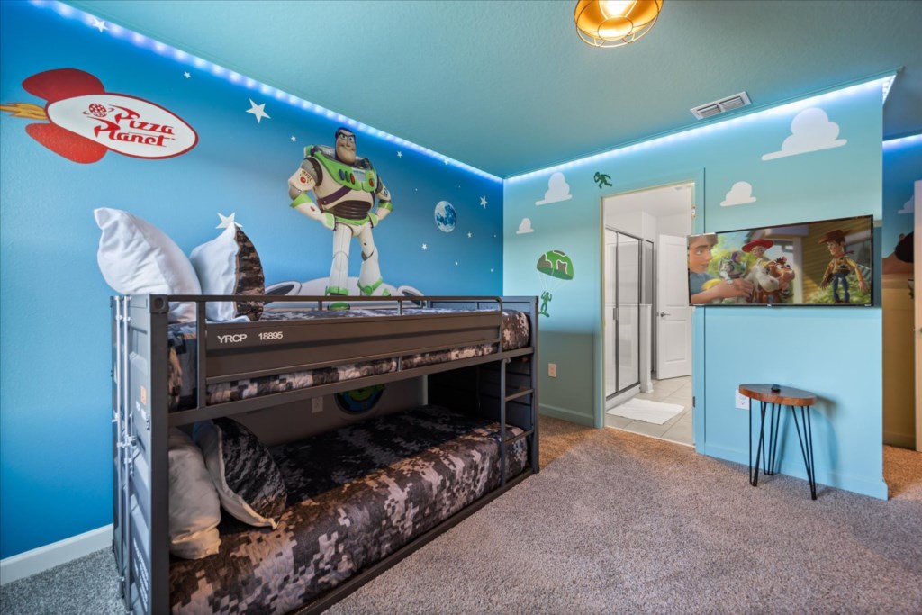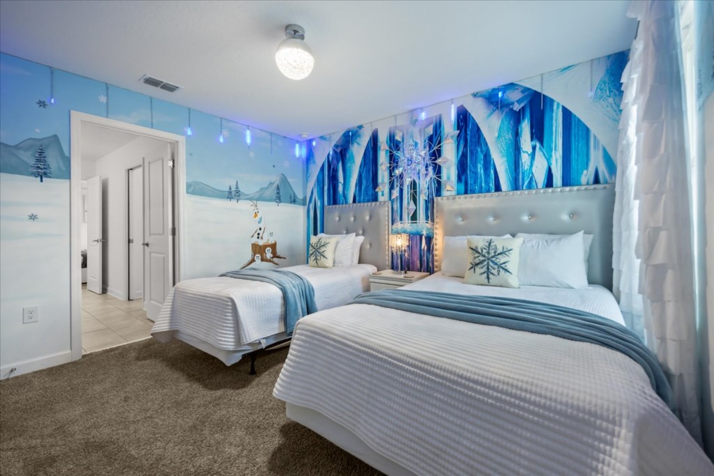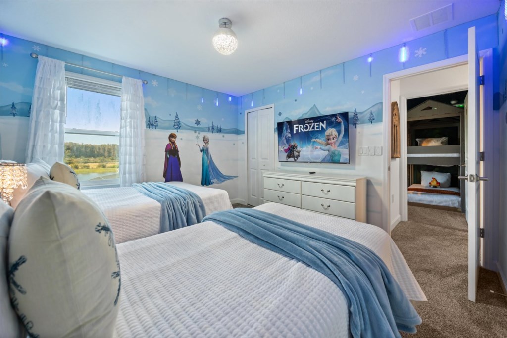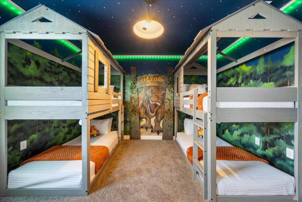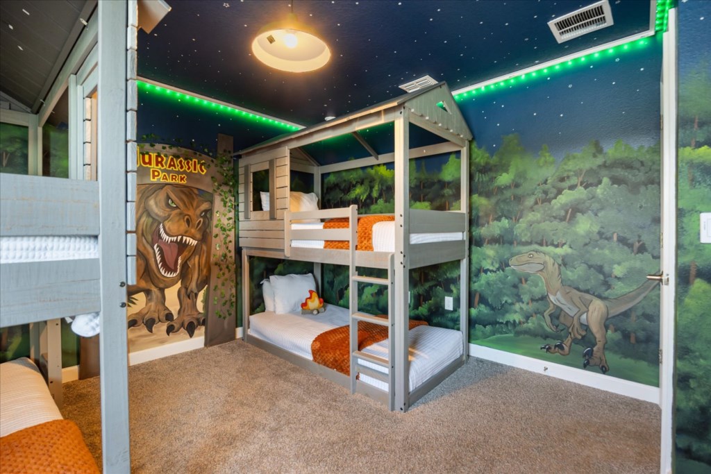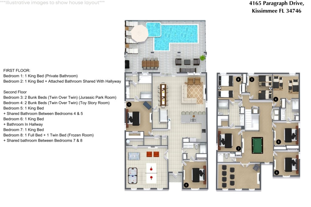 • Community: Storey Lake • 8 Bedrooms/ 5 Bathrooms/ Sleeps 21 • Disney World® (6.9 miles) SeaWorld (10.3 miles) • Convention Center (11.1 miles) ICON Park (12.6 miles) • Universal Studios (17.2 miles) Epic Universe (12.3 miles) • Location: Paragraph Drive, Kissimmee FL 34746 DETAILS • 4,289 sqft • Central AC • Washer & Dryer • Cable TV & Wi-Fi • TV In Every Bedroom • Fully Equipped Kitchen • Towels & Linens Provided • Washcloths Are Not Provided • Family Room with Flat Screen TV • Hair Dryers, Iron & Ironing Board • Private Door Code for Each Guest Stay • Outdoor Patio Furniture with Sun Loungers • Pack 'n play/ High Chair (Free Upon Request) • Private Screened-in Pool + Child Safety Pool Fence - BEDROOM SETUP FIRST FLOOR: Bedroom 1: 1 King Bed (Private Bathroom) Bedroom 2: 1 King Bed + Attached Bathroom Shared With Hallyway Second Floor Bedroom 3: 2 Bunk Beds (Twin Over Twin) (Jurassic Park Room) Bedroom 4: 2 Bunk Beds (Twin Over Twin) (Toy Story Room) Bedroom 5: 1 King Bed + Shared Bathroom Between Bedrooms 4 & 5 Bedroom 6: 1 King Bed + Bathroom In Hallway Bedroom 7: 1 King Bed Bedroom 8: 1 Full Bed + 1 Twin Bed (Frozen Room) + Shared bathroom Between Bedrooms 7 & 8 - USEFUL INFORMATION • CHECKING IN AND OUT - Check-in after 4:00 PM - Checkout before 10:00 AM • PARKING - Parking is free. - No street parking. - No parking on the grass. - No parking or blocking the sidewalk. - Vehicle in violation of parking policy will be towed at the guest's expense. - Commercial vehicles, RV's, Trailers, Buses, Golf carts, recreational vehicles or watercraft is not permitted at Storey Lake. - The community allows up to 10 cars to enter the resort per unit. There are overflow parking spaces, but not guaranteed as they are not assigned nor reserved. • THIS HOME IS SELF-CATERING We do provide a small welcome kit to get you started. Please stop by the nearest supermarket to gather any additional items you may need for the duration of your stay. • POOL HEAT - OPTIONAL 1-Cost: $35 per day. 2-Request 48 hours in advance. 3-Minimum: 2 consecutive days. 4-Temperature will not exceed 95F. 5-Attached spa is NOT a hot tub. It can only be heated if the entire pool is heated. Both have the same temperature. It does not have jets. 6-Heater works through HEAT EXCHANGE and WILL NOT WORK in cold weather. If you still would like to heat the pool during cold conditions and it does not reach the desired temperature, we will not be able to offer a refund. The pool heater pumps have a safety system that prevents overheating of the element when the pump is working overtime in cold weather. It automatically shuts off briefly until the pump can regain its functionality efficiently. Keep in mind this service is optional and may not be available at times. • BBQ RENTAL - OPTIONAL - Cost: $75 All Stay • HOUSEKEEPING There is no daily housekeeping service provided in the rental rate. Before check-in, the unit will be thoroughly cleaned and inspected by a professional cleaning company. Clean sheets and towels will be available in the unit. Mid-stay cleaning services during your stay can be requested for an additional fee. • TRASH DISPOSAL Please dispose the trash daily in the plastic bench to keep a clean home. • ONLINE PURCHASE If the online seller uses USPS, it will not get delivered as the Post Office does not recognize vacation homes as regular addresses and the package will be returned back to the sender. Only UPS, DHL and FEDEX delivers them. In some resorts the packages are delivered to the clubhouse. FEES MAY APPLY. Some resorts may not accept them. Keep in mind we are not responsible for unexpected issues with your online purchases. If you have any questions, please contact us. • THE BRONSON CLUB - Storey Lake Clubhouse Lazy River Playground Game Room Lounge Area Fitness Center Gated Community Basketball Court Resort-Style Swimming Pool • HIDEAWAY CLUB - Storey Lake Spa Lounge Jacuzzi Tiki Bar Lazy River Restaurant Waterslides Splash Park Kayak Rental Fitness Center Gated Community Basketball Court Beach Volleyball Lagoon Style Pool Huge Resort-Style Pool 9-Hole Mini Golf Course (*Fee Required) PLEASE NOTE: Additional charges apply when the owner has to fix something or pay for additional cleaning if not complied.