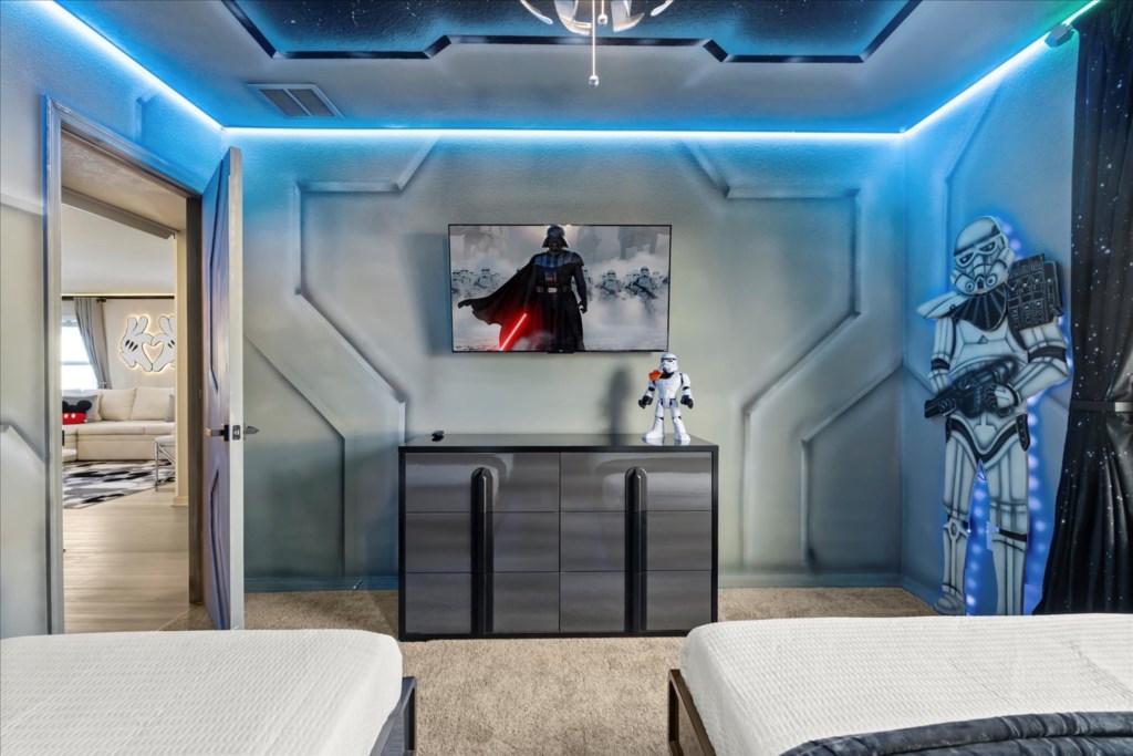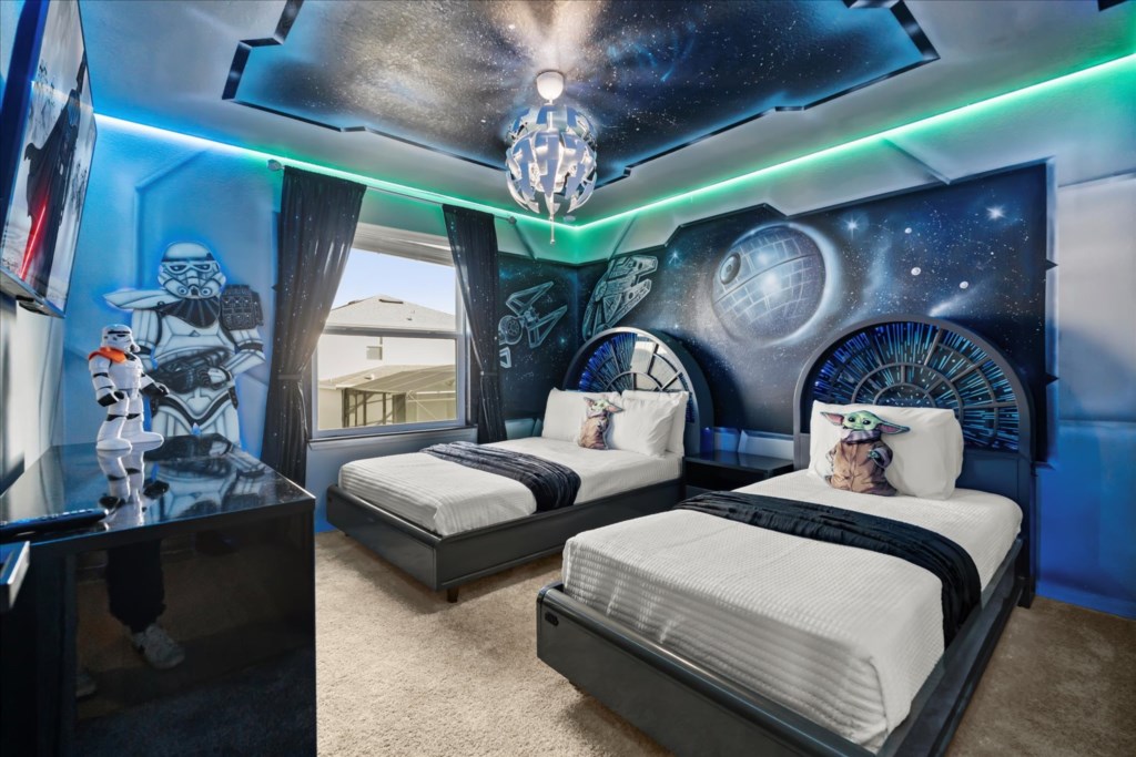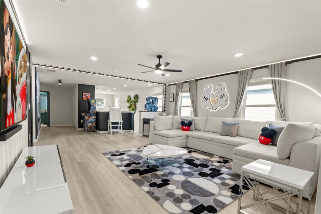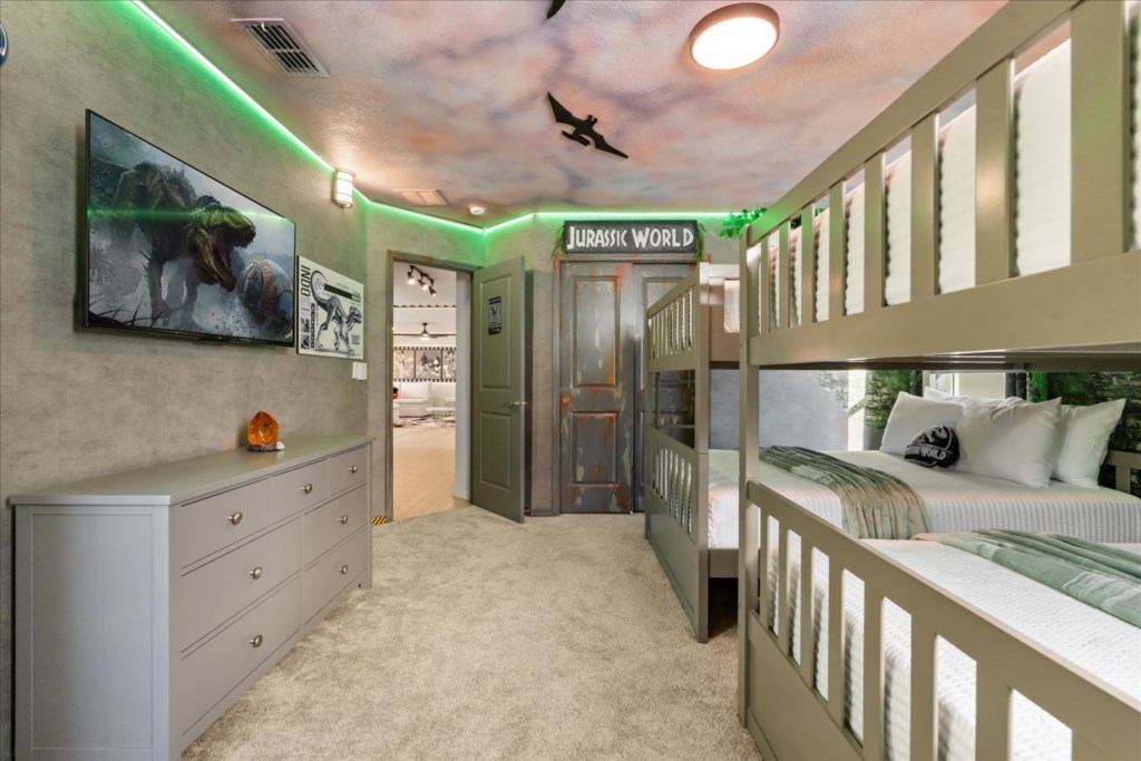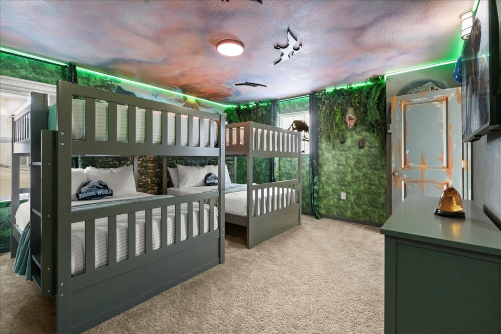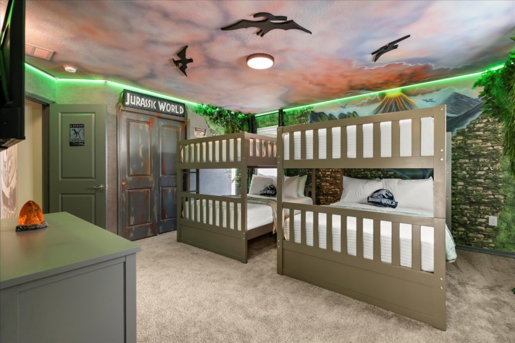 • Community: Windsor Cay • 6 Bedrooms/ 4.5 Bathrooms/ Sleeps 19 • Disney World® (8.3 miles) SeaWorld (18.5 miles) • Convention Center (19.6 miles) ICON Park (21.3 miles) • Universal Studios (22.3 miles) Epic Universe (21.3 miles) • Location: Cape Coral Loop, Clermont FL 34714 DETAILS • 3,127 sqft • Central AC • Cable TV & Wi-Fi • Washer & Dryer • TV In Every Bedroom • Fully Equipped Kitchen • Towels & Linens Provided • Washcloths Are Not Provided • Family Room with Flat Screen TV • Hair Dryers, Iron & Ironing Board • Private Door Code for Each Guest Stay • Outdoor Patio Furniture with Sun Loungers • Pack 'n play/ High Chair (Free Upon Request) • Private Screened-in Pool + Child Safety Pool Fence - BEDROOM SETUP FIRST FLOOR Bedroom 1: 1 King Bed + Attached Bathroom Shared With Pool + Half Bathroom SECOND FLOOR Bedroom 2: 1 King Bed (Versace Room) Bedroom 3: 1 Full Bed + 1 Twin Bed (Star Wars Room) + Shared Bathroom Between Bedrooms 2 & 3 Bedroom 4: 1 King Bed (LV Room) Bedroom 5: 1 Bunk Beds (Twin Over Twin) (Frozen Room) + Shared Bathroom Between Bedrooms 4 & 5 Bedroom 6: 2 Bunk Beds (Full Over Full) (Jurassic Room) (Private Bathroom) - USEFUL INFORMATION • CHECKING IN AND OUT - Check-in after 4:00 PM - Checkout before 10:00 AM • WINDSOR CAY PARKING - Parking is free. - Garage converted to Game Room - 2 vehicles per unit in the driveway. - No parking on the street. (Since it is a new community, they will not enforce this rule until the signs are placed.) - No parking on grass or blocking the sidewalks. - Registered guests cannot share their parking passes with unregistered visitors. - Commercial Vehicles, RV's, Trailers, Buses, Golf Carts or Boats are not allowed at Windsor Cay. - Vehicle in violation of parking policy will be towed at the guest's expense. • THIS HOME IS SELF-CATERING We do provide a small welcome kit to get you started. Please stop by the nearest supermarket to gather any additional items you may need for the duration of your stay. • POOL HEAT - OPTIONAL 1-Cost: $35 per day. 2-Minimum: 2 consecutive days. 3-Temperature will not exceed 95F. 4-Must be requested 48h in advance. 5-Attached spa is NOT a hot tub. It can only be heated if the entire pool is heated. They both will have the same temperature. It does not have jets. 6-Heater works through HEAT EXCHANGE and WILL NOT WORK in cold weather. If you still would like to heat the pool during cold conditions and it does not reach the desired temperature, we will not be able to offer a refund. The pool heater pumps have a safety system that prevents overheating of the element when the pump is working overtime in cold weather. It automatically shuts off briefly until the pump can regain its functionality efficiently. Keep in mind this service is optional and may not be available at times. • BBQ RENTAL - OPTIONAL - Cost: $75 All Stay • TRASH DISPOSAL Please place trash in the plastic bin daily to keep a clean home. • HOUSEKEEPING There is no daily housekeeping service provided in the rental rate. Before check-in, the unit will be thoroughly cleaned and inspected by a professional cleaning company. Clean sheets and towels will be available in the unit. Mid-stay cleaning services during your stay can be requested for an additional fee. • ONLINE PURCHASE If the online seller uses USPS, it will not get delivered as the Post Office does not recognize vacation homes as regular addresses and the package will be returned back to the sender. Only UPS, DHL and FEDEX delivers them. In some resorts the packages are delivered to the clubhouse. Fees may apply. Some resorts may not accept them. Keep in mind we are not responsible for unexpected issues with your online purchases. If you have any questions, please contact us. • REEF CLUB - Windsor Cay Resort - Arcade - Lazy River - Fitness Center - Family Cabanas - 9-Hole Mini Golf - Dual Water Slides - Gated Community - Volleyball & Cornhole - Children's Splash Pad - Outdoor Covered Bar - Blue Lagoon Bar & Grille - Resort-Style Zero-Entry Pool Resort registration needed. PLEASE NOTE: Additional charges apply when the owner has to fix something or pay for additional cleaning if not complied.