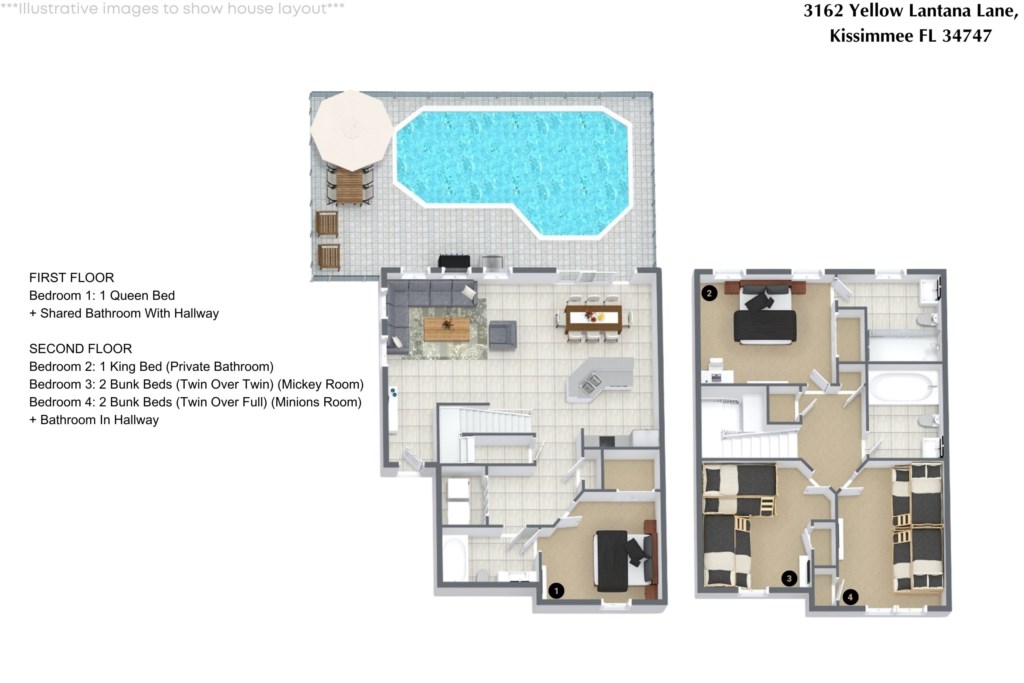 • Community: Encantada Resort • 4 Bedrooms/ 3 Bathrooms/ Sleeps 14 • Disney World® (4.1 miles) SeaWorld (14.3 miles) • Convention Center (15.4 miles) ICON Park (16.9 miles) • Universal Studios (18.1 miles) Epic Universe (16.9 miles) • Location: Yellow Lantana Lane, Kissimmee FL 34747 DETAILS • 1,636 sqft • Central AC • Washer & Dryer • Cable TV & Wi-Fi • TV In Every Bedroom • Fully Equipped Kitchen • Towels & Linens Provided • Washcloths Are Not Provided • Family Room with Flat Screen TV • Hair Dryers, Iron & Ironing Board • Private Door Code for Each Guest Stay • Outdoor Patio Furniture with Sun Loungers • Pack 'n play/ High Chair (Free Upon Request) • Private Screened-in Pool + Child Safety Pool Fence - BEDROOM SETUP FIRST FLOOR Bedroom 1: 1 Queen Bed + Shared Bathroom With Hallway SECOND FLOOR Bedroom 2: 1 King Bed (Private Bathroom) Bedroom 3: 2 Bunk Beds (Twin Over Twin) (Mickey Room) Bedroom 4: 2 Bunk Beds (Twin Over Full) (Minions Room) + Bathroom In Hallway - USEFUL INFORMATION • CHECKING IN AND OUT - Check-in after 4:00 PM - Checkout before 10:00 AM • PARKING - Parking is free. - There are parking spots on the street. They are not numbered. - Commercial Vehicles, RV's, Trailers, Buses, Golf Carts or Boats are not allowed at Encantada Resort. • THIS HOME IS SELF-CATERING We do provide a small welcome kit to get you started. Please stop by the nearest supermarket to gather any additional items you may need for the duration of your stay. • POOL HEAT - OPTIONAL 1-Cost: $35 per day. 2-Request 48 hours in advance. 3-Minimum: 2 consecutive days. 4-Temperature will not exceed 95F. 5-Heater works through HEAT EXCHANGE and WILL NOT WORK in cold weather. If you still would like to heat the pool during cold conditions and it does not reach the desired temperature, we will not be able to offer a refund. The pool heater pumps have a safety system that prevents overheating of the element when the pump is working overtime in cold weather. It automatically shuts off briefly until the pump can regain its functionality efficiently. Keep in mind this service is optional and may not be available at times. • BBQ RENTAL - OPTIONAL - Cost: $75 All Stay • TRASH DISPOSAL Please place trash to the dumpster to keep a clean home. • HOUSEKEEPING There is no daily housekeeping service provided in the rental rate. Before check-in, the unit will be thoroughly cleaned and inspected by a professional cleaning company. Clean sheets and towels will be available in the unit. Mid-stay cleaning services during your stay can be requested for an additional fee. • ONLINE PURCHASE If the online seller uses USPS, it will not get delivered as the Post Office does not recognize vacation homes as regular addresses and the package will be returned back to the sender. Only UPS, DHL and FEDEX delivers them. In some resorts the packages are delivered to the clubhouse. FEES MAY APPLY. Some resorts may not accept them. Keep in mind we are not responsible for unexpected issues with your online purchases. If you have any questions, please contact us. • ENCANTADA RESORT AMENITIES - Hot Tub - Game Room - Jogging Track - Fitness Center - Gated Community - Children's Playground - Two Outdoor Swimming Pools - The Cabana Poolside Bar and Grill PLEASE NOTE: Additional charges apply when the owner has to fix something or pay for additional cleaning if not complied.