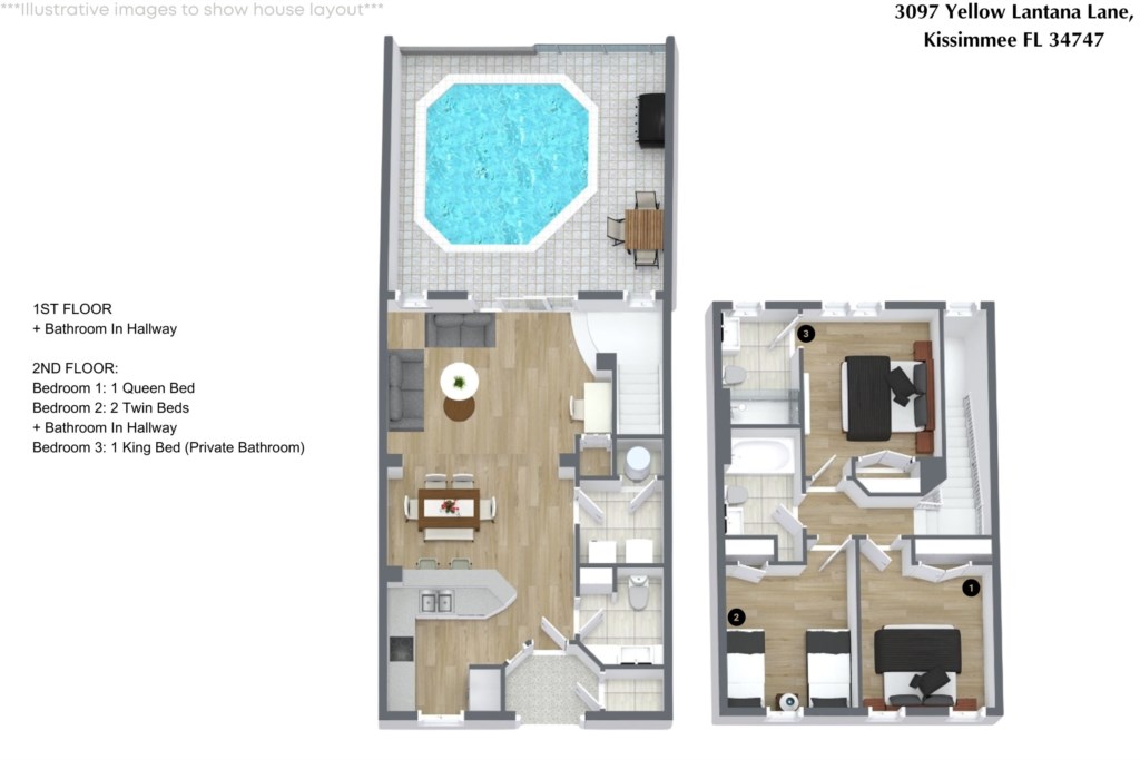 • Community: Encantada Resort • 3 Bedrooms/ 3 Bathrooms/ Sleeps 8 • Disney World® (4.1 miles) SeaWorld (14.3 miles) • Convention Center (15.4 miles) ICON Park (16.9 miles) • Universal Studios (18.1 miles) Epic Universe (16.9 miles) • Location: Yellow Lantana Lane, Kissimmee FL 34747 DETAILS • 1,295 sqft • Central AC • Washer & Dryer • Cable TV & Wi-Fi • TV In Every Bedroom • Fully Equipped Kitchen • Towels & Linens Provided • Washcloths Are Not Provided • Family Room with Flat Panel TV • Patio Furniture & Sun Loungers • Hair Dryers, Iron & Ironing Board • Private Door Code for Each Guest Stay • Portable Crib & High Chair (Free Upon Request) • Private Screened-in Pool + Child Safety Pool Fence - BEDROOM SETUP FIRST FLOOR Living Room: 1 Sofa Bed + Bathroom In Hallway SECOND FLOOR Bedroom 1: 1 Queen Bed Bedroom 2: 2 Twin Beds + Bathroom In Hallway Bedroom 3: 1 King Bed (Private Bathroom) - USEFUL INFORMATION • CHECKING IN AND OUT - Check-in after 4:00 PM - Checkout before 10:00 AM • PARKING Parking is free. Commercial Vehicles, RVS, Trailers, Buses, Golf Carts or Boats are not allowed at Encantada Resort. • THIS HOME IS SELF-CATERING We do provide a small welcome kit to get you started. Please stop by the nearest supermarket to gather any additional items you may need for the duration of your stay. • POOL HEAT - OPTIONAL 1-Cost: $35 per day. 2-Request 48 hours in advance. 3-Minimum: 2 consecutive days. 4-Temperature will not exceed 95F. 5-Heater works through HEAT EXCHANGE and WILL NOT WORK in cold weather. If you still would like to heat the pool during cold conditions and it does not reach the desired temperature, we will not be able to offer a refund. The pool heater pumps have a safety system that prevents overheating of the element when the pump is working overtime in cold weather. It automatically shuts off briefly until the pump can regain its functionality efficiently. Keep in mind this service is optional and may not be available at times. • BBQ RENTAL - OPTIONAL - Cost: $75 All Stay • TRASH DISPOSAL Please place trash in the bench or bin daily to keep a clean home. • HOUSEKEEPING There is no daily housekeeping service provided in the rental rate. Before check-in, the unit will be thoroughly cleaned and inspected by a professional cleaning company. Clean sheets and towels will be available in the unit. Mid-stay cleaning services during your stay can be requested for an additional fee. • ONLINE PURCHASE If the online seller uses USPS, it will not get delivered as the Post Office does not recognize vacation homes as regular addresses and the package will be returned back to the sender. Only UPS, DHL and FEDEX delivers them. In some resorts the packages are delivered to the clubhouse. FEES MAY APPLY. Some resorts may not accept them. Keep in mind we are not responsible for unexpected issues with your online purchases. If you have any questions, please contact us. ENCANTADA RESORT AMENITIES • Pool Complex • Table Tennis • Bar / Lounge • Jogging Track • Fitness Center • Gated Community • Children's Playground PLEASE NOTE: Additional charges apply when the owner has to fix something or pay for additional cleaning if not complied.