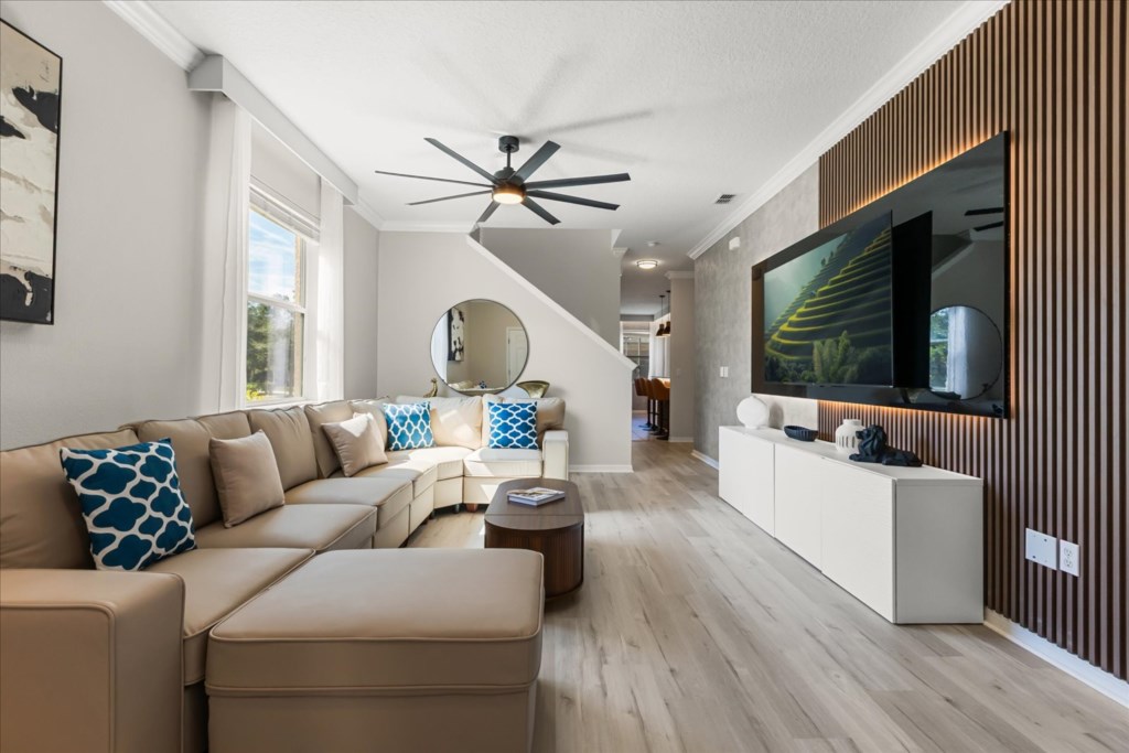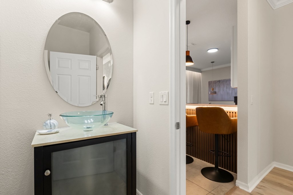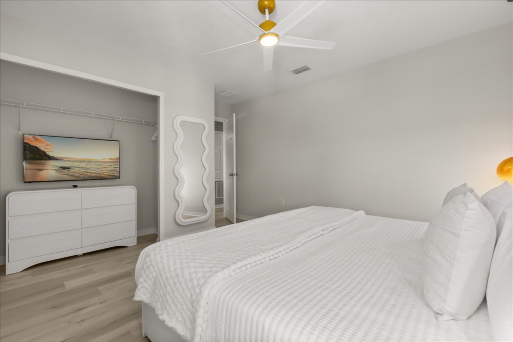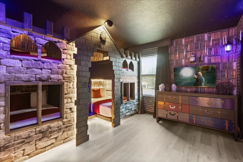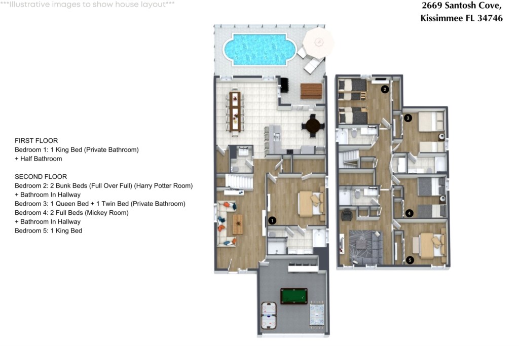 • Community: Veranda Palms • 5 Bedrooms/ 4.5 Bathrooms/ Sleeps 19 • Disney (9.0 miles) SeaWorld (10.8 miles) Universal (13.7 miles) • Convention Center (10.2 miles) Legoland (32.2 miles) • Location: Santosh Cove, Kissimmee FL 34746 DETAILS • 2,806 sqft • Central AC • Washer & Dryer • Free Cable TV & WIFI • TV In Every Bedroom • Fully Equipped Kitchen • Towels & Linens Provided • Washcloths Are Not Provided • Family Room with Flat Screen TV • Hair Dryers, Iron & Ironing Board • Private Door Code for Each Guest Stay • Outdoor Patio Furniture with Sun Loungers • Pack 'n play/ High Chair (Free Upon Request) • Private Screened-in Pool + Child Safety Pool Fence - BEDROOM SETUP FIRST FLOOR Bedroom 1: 1 King Bed (Private Bathroom) + Half Bathroom SECOND FLOOR Bedroom 2: 2 Bunk Beds (Full Over Full) (Harry Potter Room) + Bathroom In Hallway Bedroom 3: 1 Queen Bed + 1 Twin Bed (Private Bathroom) Bedroom 4: 2 Full Beds (Mickey Room) + Bathroom In Hallway Bedroom 5: 1 King Bed - USEFUL INFORMATION • CHECKING IN AND OUT - Check-in after 4:00 PM - Checkout before 10:00 AM • VERANDA PALMS PARKING - Parking is free. - 2 vehicles on the driveway + 1 vehicle paralel to the street between the sidewalk and the street. Make sure the wheels are not on the grass and the vehicle is not blocking the sidewalk. - Garage converted to game room. - No parking on the street, grass or blocking the sidewalks. - Commercial vehicles, RV's, trailers, buses, golf carts or boats are not allowed. > Failure to follow the community guidelines may result in the car being towed at the guest's expense. • THIS HOME IS SELF-CATERING We do provide a small welcome kit to get you started. Please stop by the nearest supermarket to gather any additional items you may need for the duration of your stay. • POOL HEAT - OPTIONAL 1-Cost: $75 per day. 2-Minimum: 2 consecutive days. 3-Temperature will not exceed 95F. 4-Must be requested 48h in advance. 5-Attached spa is NOT a jacuzzi. It does not have jets. It can only be heated if the entire pool is heated. They both will have the same temperature. 6-Heater works through HEAT EXCHANGE and WILL NOT WORK in cold weather. If you still would like to heat the pool during cold conditions and it does not reach the desired temperature, we will not be able to offer a refund. Our pool heater pumps have a safety system that prevents overheating of the element when the pump is working overtime in cold weather conditions. This way causes a temporary shut off of services automatically until the pump can regain its functionality efficiently. This is optional and may not be available at times. • BBQ RENTAL - OPTIONAL - Cost: $75 All Stay • TRASH DISPOSAL Please place trash in the plastic bench daily to keep a clean home. There is a dumpster near the clubhouse to dispose reciclables. • HOUSEKEEPING There is no daily housekeeping service provided in the rental rate. Before check-in, the unit will be thoroughly cleaned and inspected by a professional cleaning company. Clean sheets and towels will be available in the unit. Mid-stay cleaning services during your stay can be requested for an additional fee. • ONLINE PURCHASE If the online seller uses USPS, it will not get delivered as the Post Office does not recognize vacation homes as regular addresses and the package will be returned back to the sender. Only UPS, DHL and FEDEX delivers them. In some resorts the packages are delivered to the clubhouse. Fees may apply. Some resorts may not accept them. Keep in mind we are not responsible for unexpected issues with your online purchases. If you have any questions, please contact us. • VERANDA PALMS AMENITIES - Lake - Lounge - Hot Tub - Game Room - Walking Trail - Fitness Center - Gated Community - Beach-entry Pool - Children’s play area with multi-deck climbing frame PLEASE NOTE: Additional charges apply when the owner has to fix something or pay for additional cleaning if not complied.