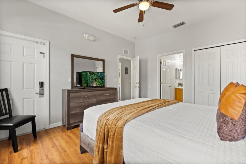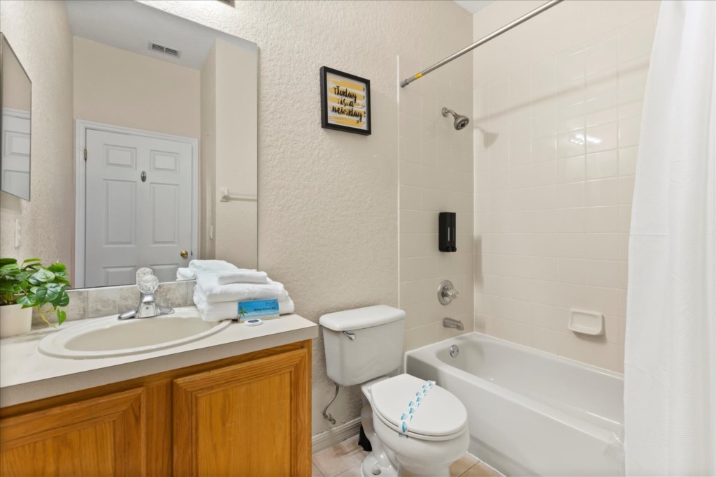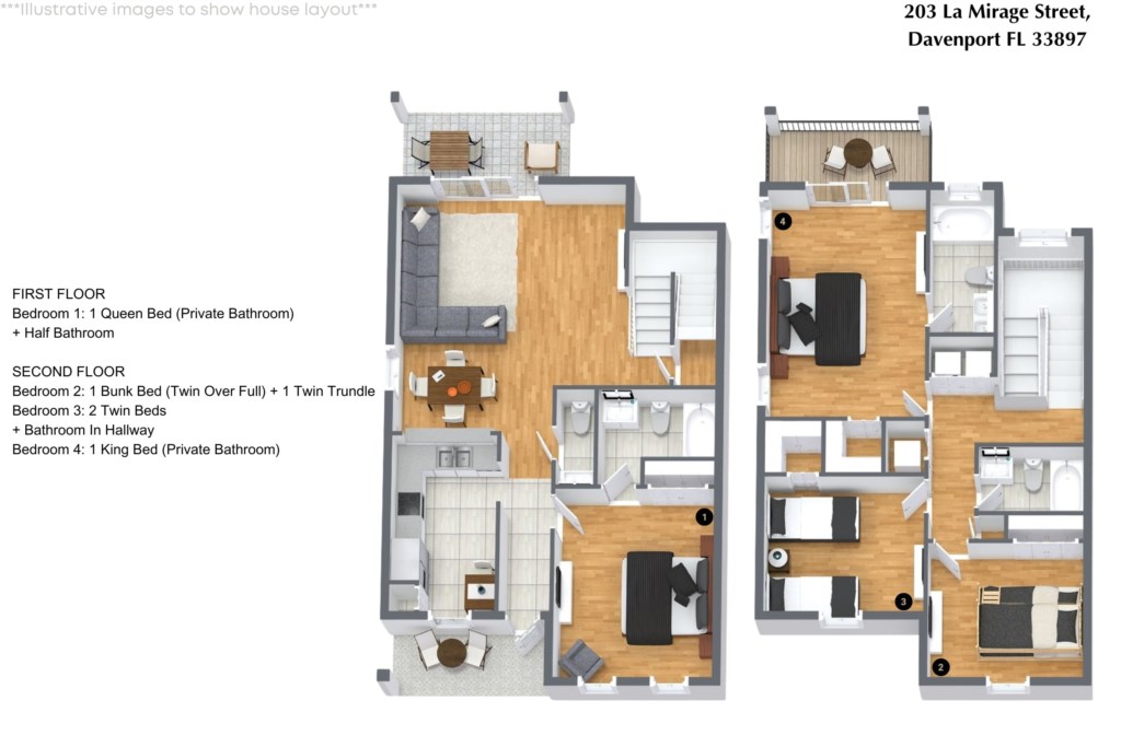 • Community: Regal Palms • 4 Bedrooms/ 3.5 Bathrooms/ Sleeps 10 • Disney World® (8.5 miles) SeaWorld (17.6 miles) • Convention Center (18.7 miles) ICON Park (20.4 miles) • Universal Studios (21.5 miles) Epic Universe (20.9 miles) • Location: La Mirage Street, Davenport FL 33897 DETAILS • 1,856 sqft • Central AC • Washer & Dryer • Cable TV & Wi-Fi • Covered Balcony • Gated Community • Fully Equipped Kitchen • Towels & Linens Provided • Washcloths Are Not Provided • Family Room with Flat Panel TV • Hair Dryers, Iron & Ironing Board • Private Door Code for Each Guest Stay • Pack 'n play/ High Chair (Free Upon Request) - BEDROOM SETUP FIRST FLOOR Bedroom 1: 1 Queen Bed (Private Bathroom) + Half Bathroom SECOND FLOOR Bedroom 2: 1 Bunk Bed (Twin Over Full) + 1 Twin Trundle Bedroom 3: 2 Twin Beds + Bathroom In Hallway Bedroom 4: 1 King Bed (Private Bathroom) - USEFUL INFORMATION • CHECKING IN AND OUT - Check-in after 4:00 PM - Checkout before 10:00 AM REGAL PALMS RESORT - $20 + 12% tax PER DAY / PER HOME It is paid directly to the Regal Palms Resort at check-in. This fee is mandatory and intended to cover maintenance and security costs of the resort. When you check-in at the front desk, you will receive a pass that gives you access to the gate and the home. A wristband will be given which allows access to the resort area. Amenities: - Sauna - Hot Tub - Lazy River - Water Slide - Clubhouse - Fitness Center - Resort-Style Pool - Complimentary towel service and lounge chairs in the pool area. - RESORT REGISTRATION NEEDED AFTER BOOKING CONFIRMATION. • PARKING Parking is free up to 3 vehicles. $10 + tax per day for each additional vehicle. Commercial vehicles, RV's, Trailers, Buses, Golf carts, recreational vehicles, or watercraft is not permitted at Regal Palms. • THIS HOME IS SELF-CATERING We do provide a small welcome kit to get you started. Please stop by the nearest supermarket to gather any additional items you may need for the duration of your stay. • TRASH DISPOSAL Please dispose the trash daily in the plastic bench or dumpster to keep a clean home. • HOUSEKEEPING There is no daily housekeeping service provided in the rental rate. Before check-in, the unit will be thoroughly cleaned and inspected by a professional cleaning company. Mid-stay cleaning services during your stay can be requested for an additional fee. • ONLINE PURCHASE If the online seller uses USPS, it will not get delivered as the Post Office does not recognize vacation homes as regular addresses and the package will be returned back to the sender. Only UPS, DHL and FEDEX delivers them. In some resorts the packages are delivered to the clubhouse. Fees may apply. Some resorts may not accept them. Keep in mind we are not responsible for unexpected issues with your online purchases. If you have any questions, please contact us. PLEASE NOTE: Additional charges apply when the owner has to fix something or pay for additional cleaning if not complied.