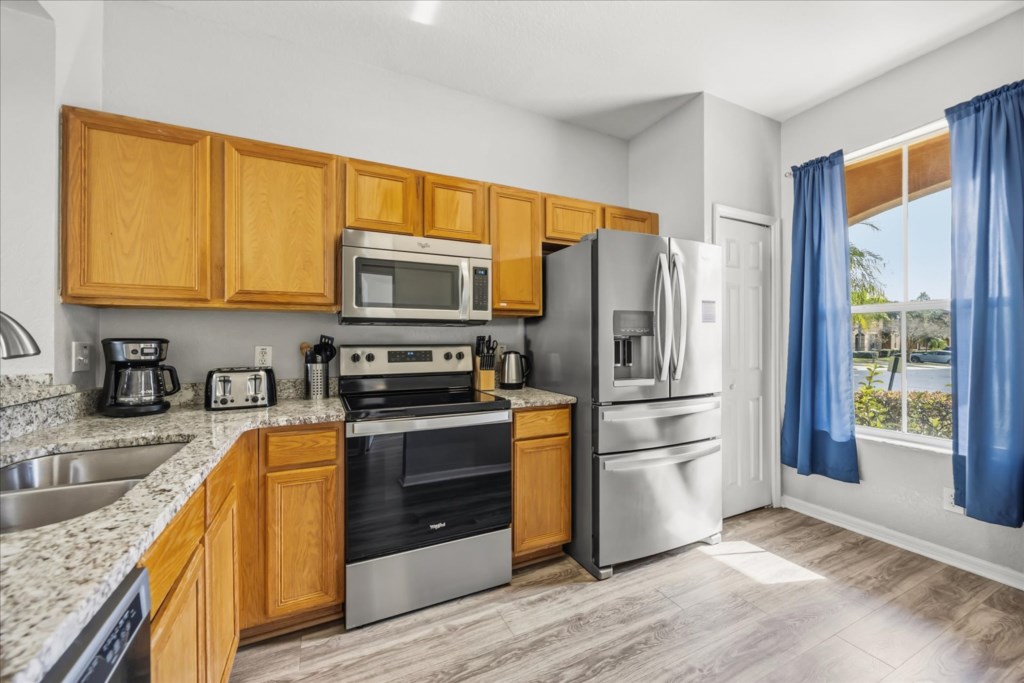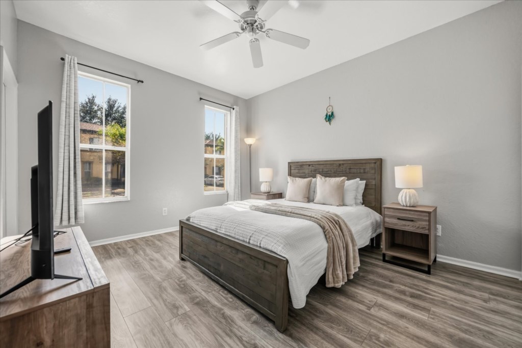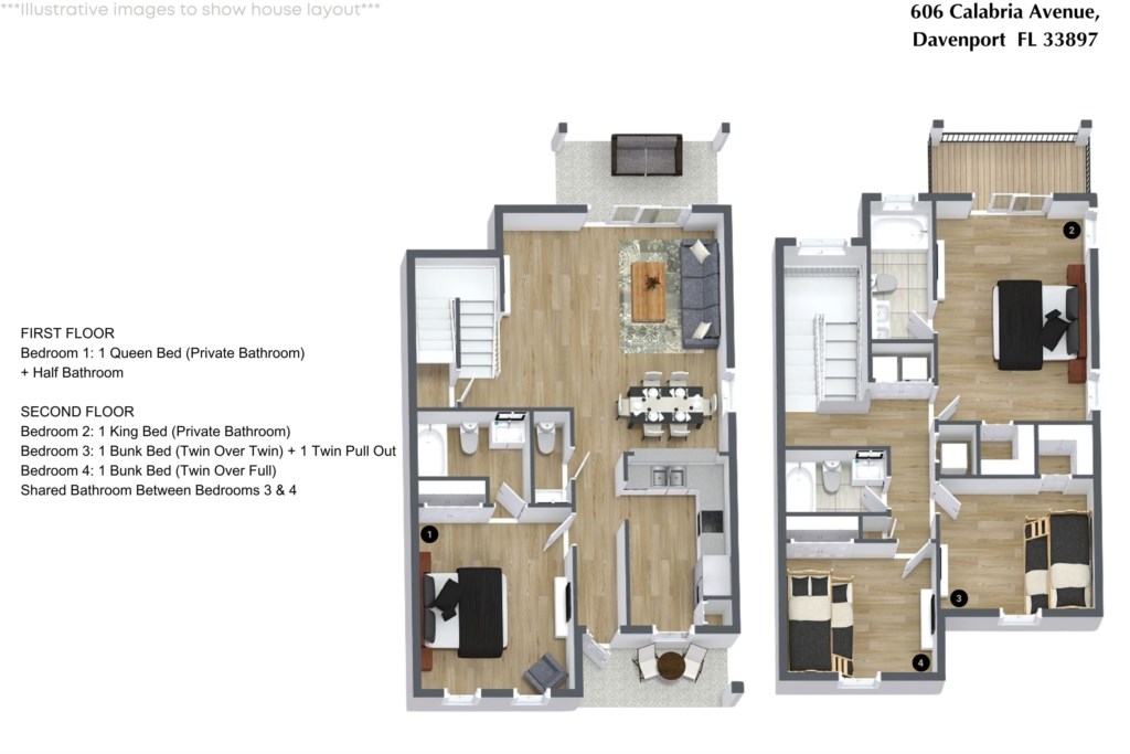 • Community: Regal Palms • 4 Bedrooms/ 3.5 Bathrooms/ Sleeps 9 • Disney (9.0 mi) SeaWorld (21.0 mi) Legoland (29.2 mi) • Convention Center (12.9 mi) Universal Studios (22.3 mi) • Location: Calabria Avenue, Davenport FL 33897 DETAILS • Central AC • Washer & Dryer • Gated Community • Formal Dining Area • TV In Every Bedroom • Free Cable TV & WIFI • Fully Equipped Kitchen • Towels & Linens provided • Washcloths are not provided • Family Room with Flat Panel TV • Hair Dryers, Iron & Ironing Board • Pack 'n play/ High Chair (Free Upon Request) - BEDROOM SETUP FIRST FLOOR Bedroom 1: 1 Queen Bed (Private Bathroom) + Half Bathroom SECOND FLOOR Bedroom 2: 1 King Bed (Private Bathroom) Bedroom 3: 1 Bunk Bed (Twin Over Twin) + 1 Twin Pull Out Bedroom 4: 1 Bunk Bed (Twin Over Full) Shared Bathroom Between Bedrooms 3 & 4 - USEFUL INFORMATION • CHECKING IN AND OUT - Check-in after 4:00 PM - Checkout before 10:00 AM REGAL PALMS RESORT - $20 + 12% tax PER DAY / PER HOME It is paid directly to the Regal Palms Resort at check-in. This fee is mandatory and intended to cover maintenance and security costs of the resort. When you check-in at the front desk, you will receive a pass that gives you access to the gate and the home. A wristband will be given which allows access to the resort area. Amenities: - Sauna - Hot Tub - Lazy River - Water Slide - Clubhouse - Fitness Center - Resort-Style Pool - Complimentary towel service and lounge chairs in the pool area. - RESORT REGISTRATION NEEDED AFTER BOOKING CONFIRMATION. • PARKING Parking is free up to 3 vehicles. $10 + tax per day for each additional vehicle. Commercial vehicles, RV's, Trailers, Buses, Golf carts, recreational vehicles, or watercraft is not permitted at Regal Palms. • THIS HOME IS SELF-CATERING We do provide a small welcome kit to get you started. Please stop by the nearest supermarket to gather any additional items you may need for the duration of your stay. • TRASH DISPOSAL Please dispose the trash daily in the plastic bench or dumpster to keep a clean home. • HOUSEKEEPING There is no daily housekeeping service provided in the rental rate. Before check-in, the unit will be thoroughly cleaned and inspected by a professional cleaning company. Mid-stay cleaning services during your stay can be requested for an additional fee. • ONLINE PURCHASE If the online seller uses USPS, it will not get delivered as the Post Office does not recognize vacation homes as regular addresses and the package will be returned back to the sender. Only UPS, DHL and FEDEX delivers them. In some resorts the packages are delivered to the clubhouse. Fees may apply. Some resorts may not accept them. Keep in mind we are not responsible for unexpected issues with your online purchases. If you have any questions, please contact us. ADDITIONAL CHARGES APPLY IF NOT COMPLIED when the owner has to fix something or pay for additional cleaning.
